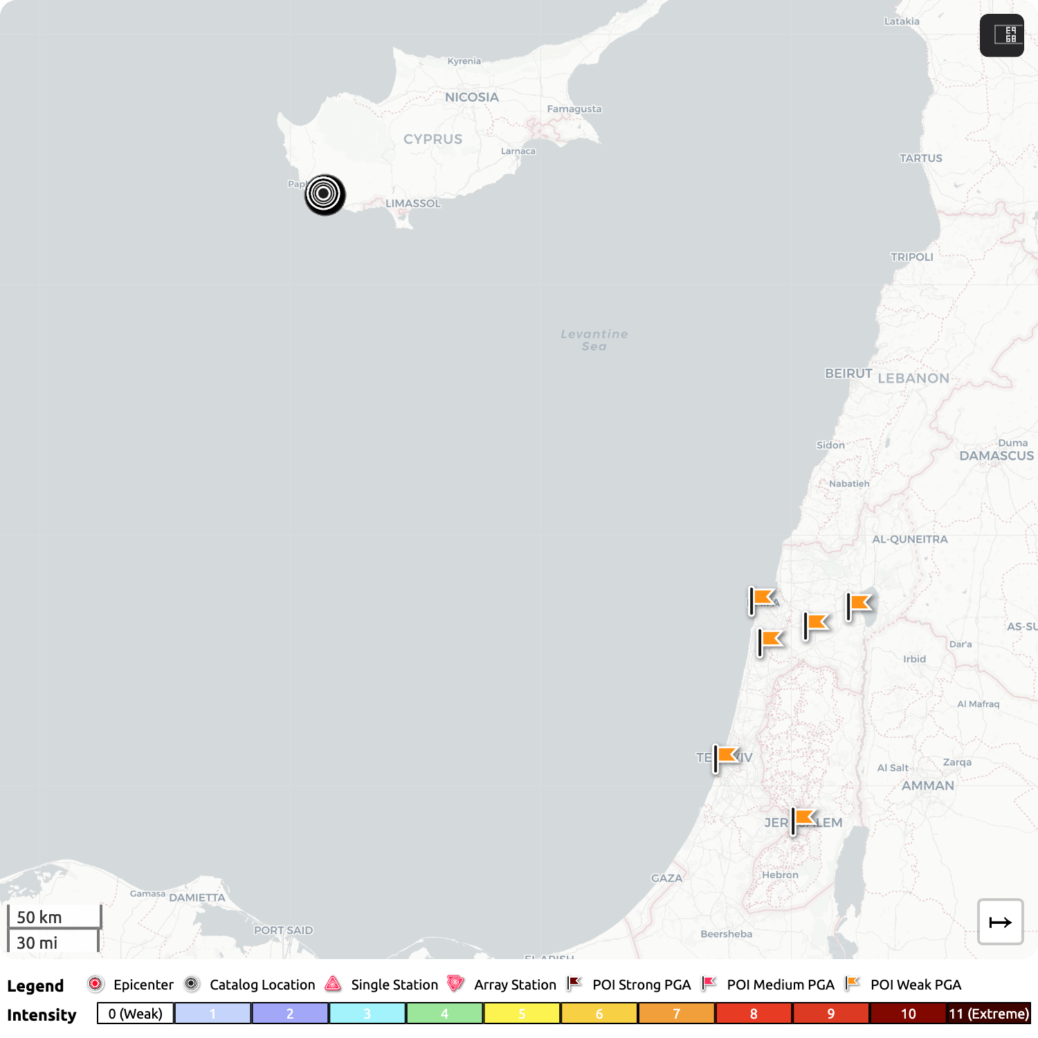 SeismicAI’s Earthquake Early Warning system detected and alerted on a magnitude 5.4 earthquake near Cyprus on 12-11-2025, 11:31:06 (UTC). Despite the earthquake occurring 300 km outside the Israeli network, SeismicAI’s system generated alerts for the shaking’s impact in northern and central Israel, and all Points of Interest between Haifa and Jerusalem received an alert for weak shaking.